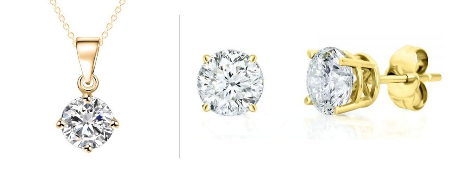 Get both our signature products in one. Our 2Ct Each "Kiss Me In Paris" stud earrings and the 2CT matching pendant— Made with a .925 sterling silver core and dipped in 14K gold vermeil with our unique Luciana Rose lab finished "Diamonds". they come in a plush gift box and last unlike CZ's