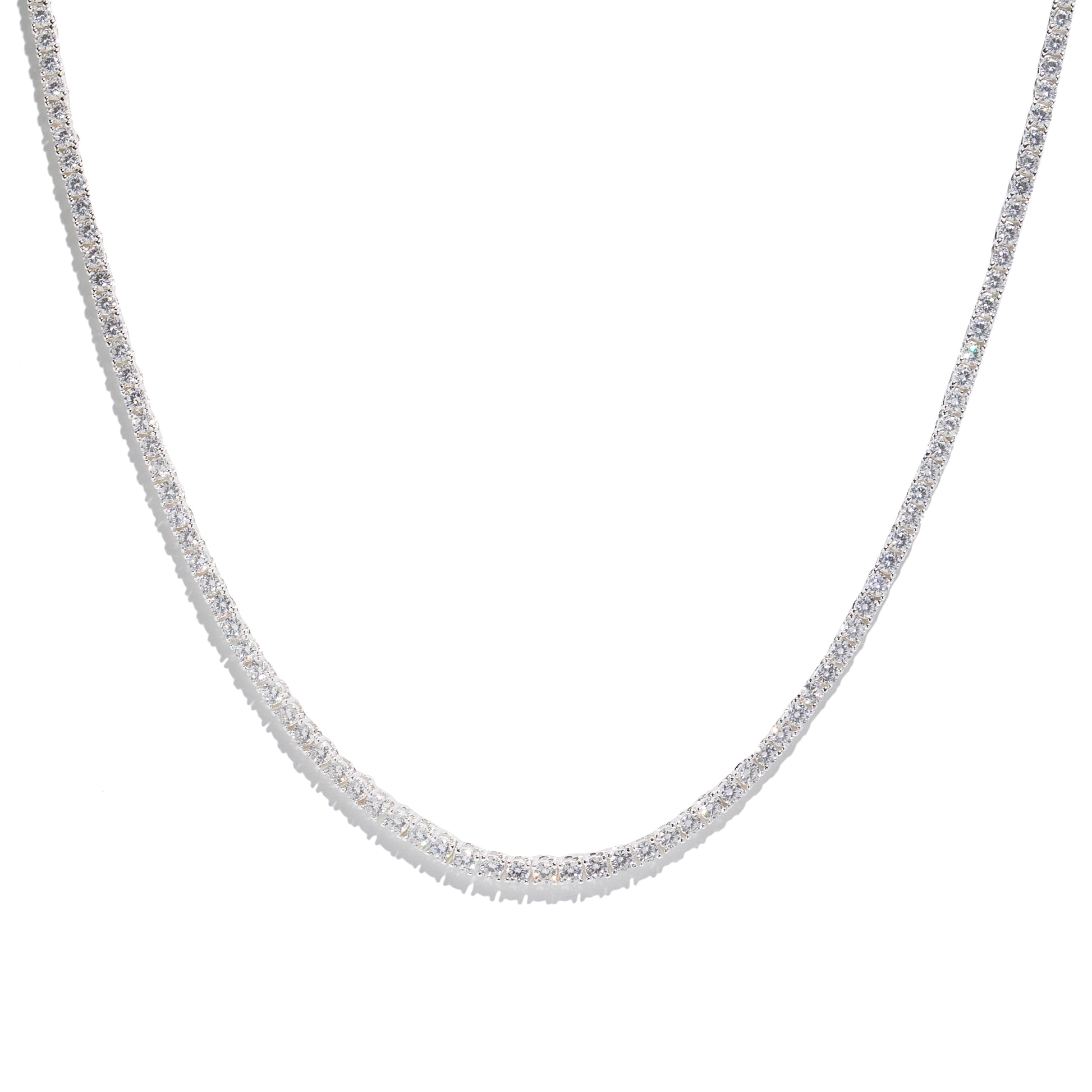 Our signature classic tennis necklace is 18 inches long and made with 18K white gold vermeil and 137 of our unique 3mm Luciana Rose lab finished "Diamonds", it comes in a plush gift box and is the perfect addition to your elegant night out.